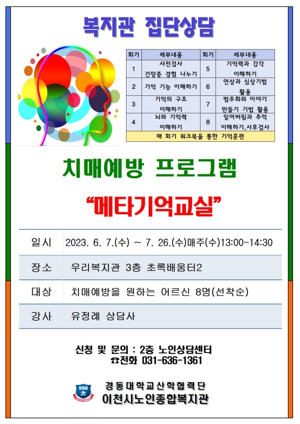 7월26일까지 매주(수) 13:00~14:00 치매예방을 위한 "메타기억 교실" 집단상담을 진행하고자 합니다.