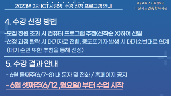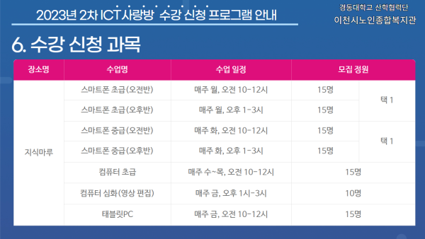 우리복지관에서는 2023년 2차 ICT사랑방 지식마루 프로그램 수강 신청을 진행합니다.