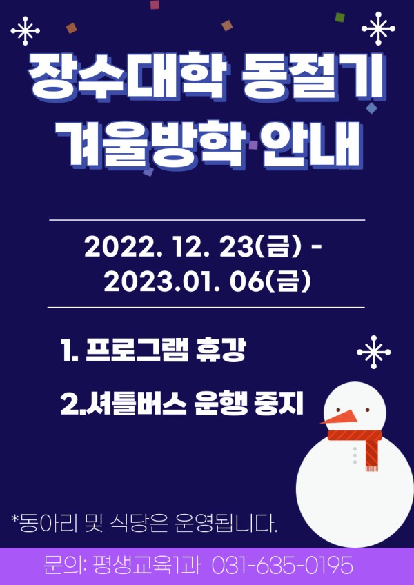 ○ 동계방학 일정 : `22년 12월 23일 (금) ~ `23년 1월 6일 (금) -2주간-
