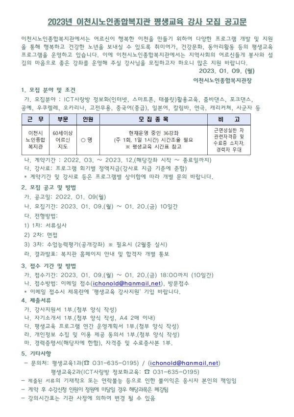 [모집] 2023년 이천시노인종합복지관 평생교육 프로그램 강사 모집 공고