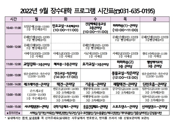 이천시노인종합복지관 장수대학 9월 프로그램 시간표를 올려드립니다.