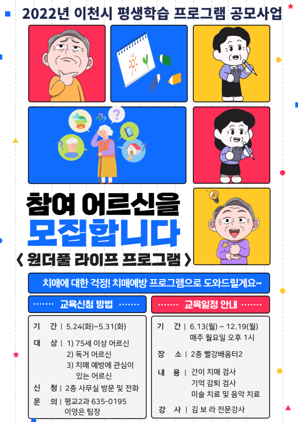 [모집] 2022년 이천시 평생학습 프로그램 공모사업 "원더풀 라이프(치매예방 프로그램)" 참여자 모집