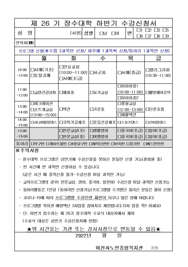 이천시노인종합복지관 에서는 2022년 제 26기 장수대학 코로나19(생활속 거리두기 실천) 하반기 프로그램 이용자 및 수강생을