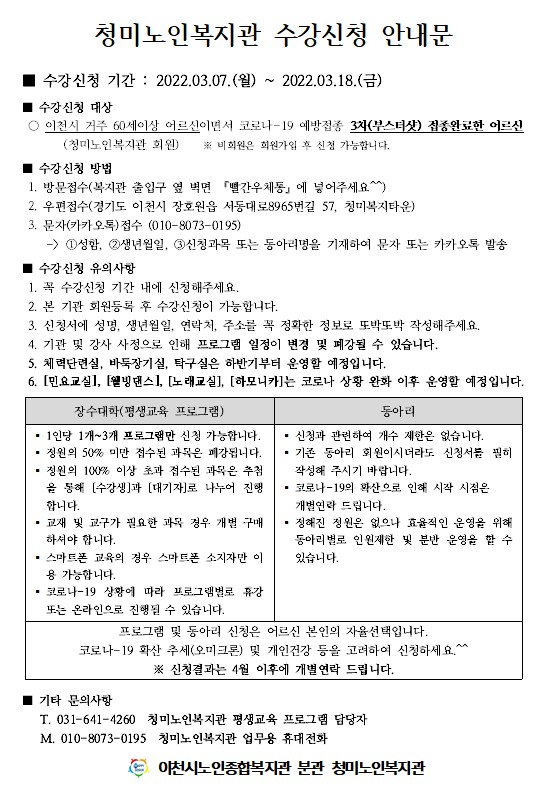 제7기 청미노인복지관 장수대학 수강신청 안내 페이지 정보 작성자관리자 작성일2022-03-18 조회수 8,801 첨부파일 2022년 제7기 청미 장수대학 수강신청 안내문 및 수강신청서(배포용).hwp (368.0K) 본문 제7기 청미노인복지관 장수대학 수강신청을 안내하오니 첨부파일을 참고해주세요^^ 이전글2022년 청미노인복지관 평생교육 강사모집 공고 2022-03-28 다음글이천시노인종합복지관 2022년 1분기 운영위원회 회의 개최 2022-03-10 목록