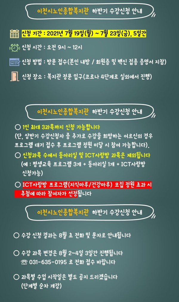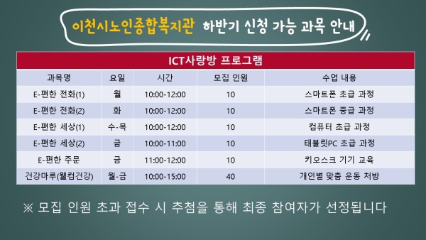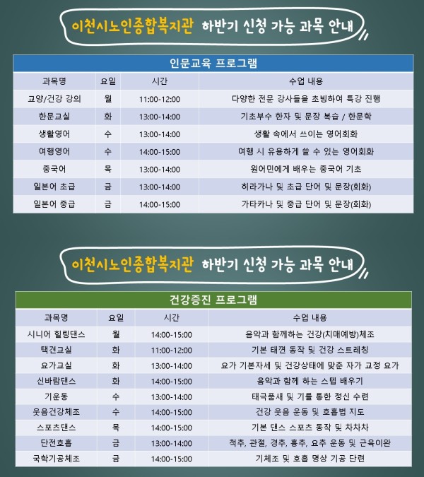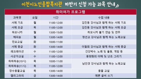 이천시노인종합복지관에서는 복지관 정회원 대상 하반기 수강신청을 진행합니다.