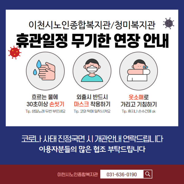 이천시노인종합복지관/청미복지관의 휴관일정이 무기한으로 연장되었습니다.