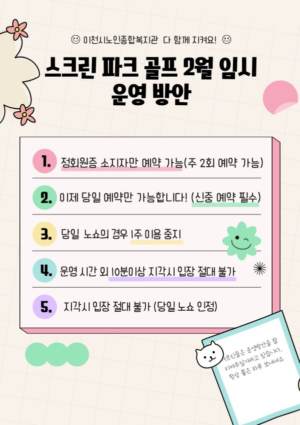 [공지] 청춘 그린 스크린 파크 골프 운영 시간, 방안 2월 시범 운영 안내