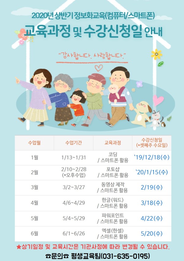 위의 일정을 참고하시어, 어르신들의 수강신청에 혼동 없으시길 바라겠습니다.^^