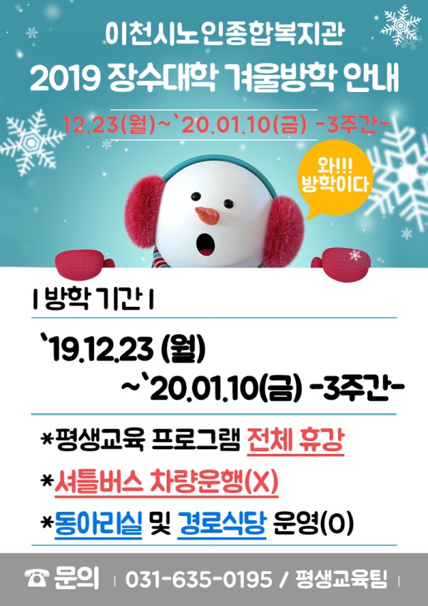 이천시노인종합복지관에서는 어르신들의 안전한 겨울나기를 위하여 다음과 같이 동계방학을 진행합니다.