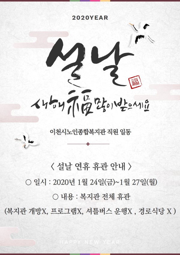 이천시노인종합복지관에서는 설날 연휴를 맞이하여 복지관을 휴관합니다.