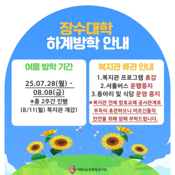 여름방학기간: 2025. 7.28.(월)~8.8.(금) 까지(* 총 2주간)