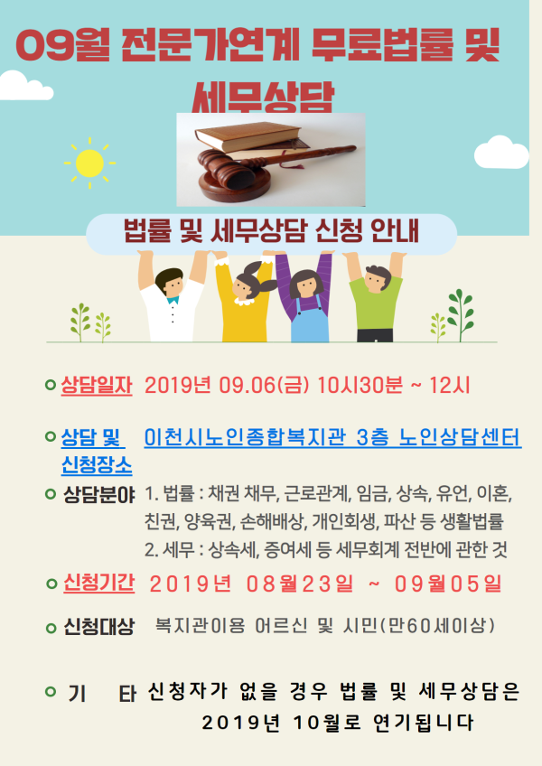 2019년 09월 전문가연계 무료 법률 및 세무상담 신청 안내