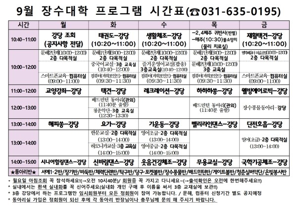 [공지] 2019년 9월 장수대학 프로그램 시간표