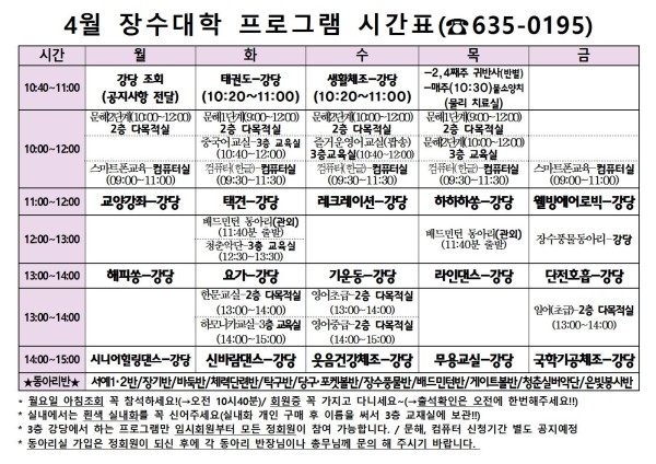 [공지] 2019년 4월 장수대학 프로그램 시간표