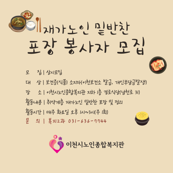 [모집] 이천시노인종합복지관 재가노인 밑반찬 포장 봉사자 모집