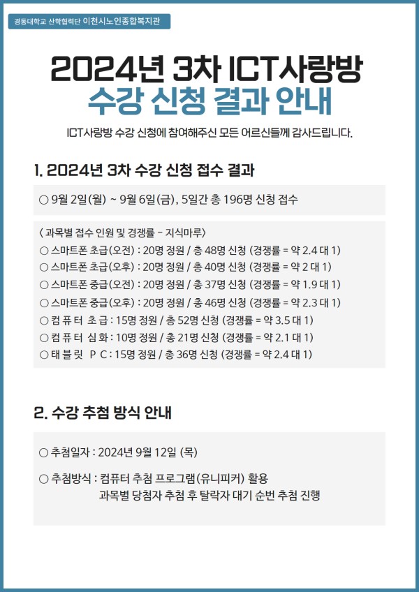 9.2.(월)~9.6.(금)까지 진행됐던 2024년 3차 ICT사랑방 지식마루 프로그램 수강 신청 결과를 발표합니다.