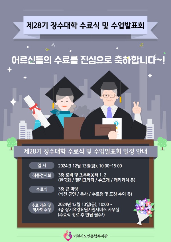 이천시노인종합복지관에서는 제28기 장수대학 수료식 및 수업발표회를 진행합니다.