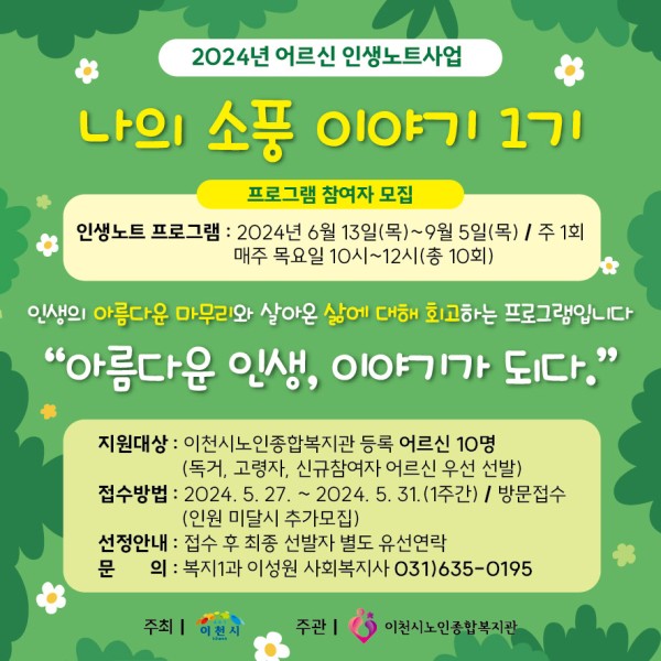 어르신 인생노트 사업은 삶에 대한 정리와 미래를 준비하여 건강하고 가치있는 웰다잉 문화를 조성하고자 이천시의 지원을 받아 운영됩니다.