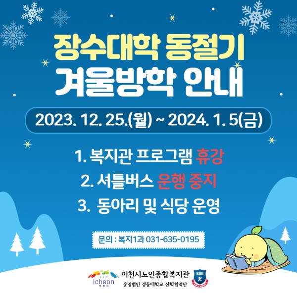 이천시노인종합복지관에서는 어르신들의 안전한 겨울나기를 위하여 다음과 같이 동계방학을 진행합니다.