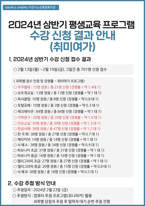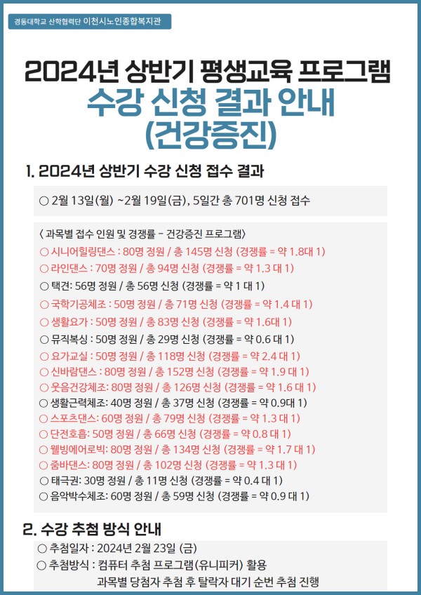 [공지] 2024년 제28기 장수대학 상반기 수강 신청 결과 안내