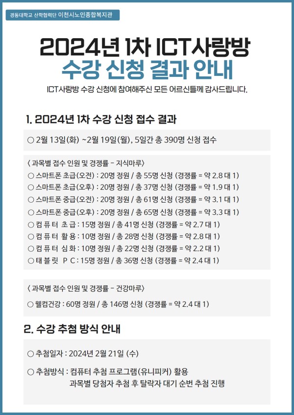 2.13.(화)~2.19.(월)까지 진행됐던 2024년 1차 ICT사랑방 프로그램 수강 신청 결과를 발표합니다.