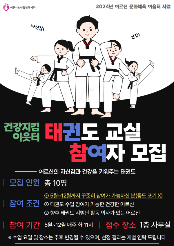 이천시노인종합복지관에서는 2024년 어르신 문화체육 이음터 공모사업의 일환으로 "건강이웃 지킴이-태권도 교실" 참여자를 모집합니다.