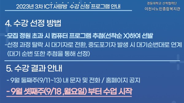 우리복지관에서는 2023년 3차 ICT사랑방 프로그램 수강 신청을 진행합니다.