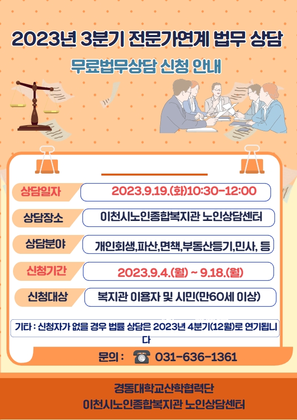 2023년 9월(3분기) 이천시노인종합복지관 노인상담센터에서는 오형선법무사사무소 법무사를연계하여 생활법률 상담을 실시하고자 합니다. 이에 상담을 원하시는 어르신은 2층 노인상담센터로 오셔서 신청해주시기 바랍니다.