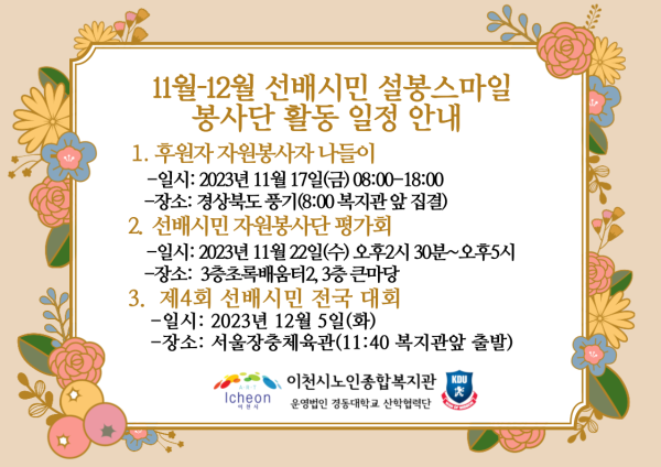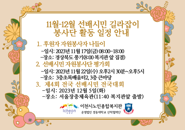 2023년 11월, 12월 선배시민 자원봉사단 활동 일정을 안내드립니다.