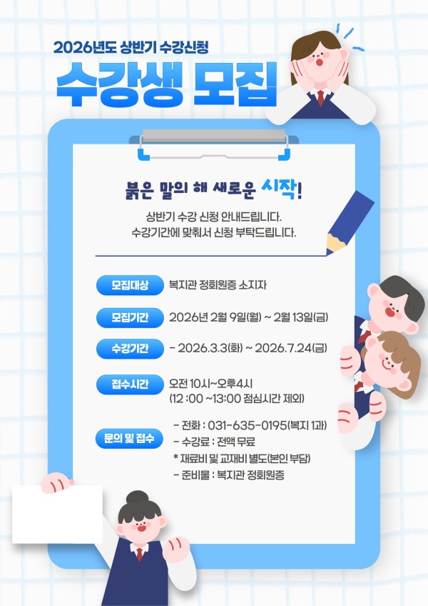 이천시노인종합복지관에서는 2026년 제30기 상반기 장수 대학 프로그램 및 1차 ICT사랑방 프로그램 수강신청을 진행합니다.