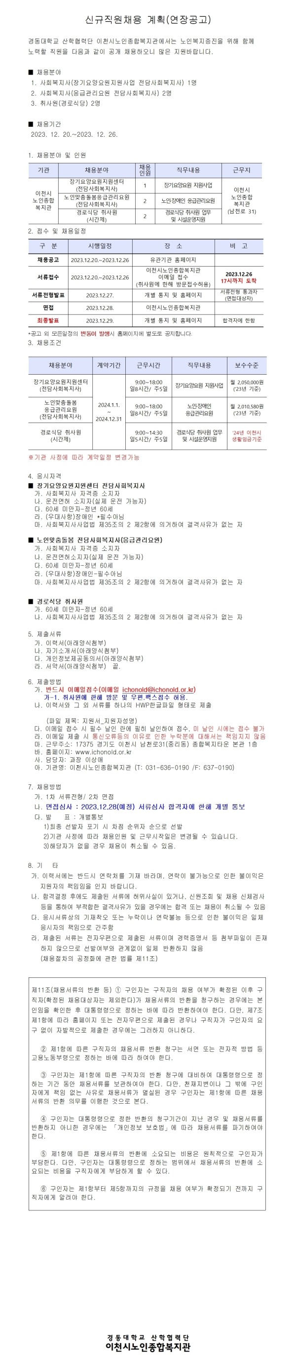 - 다음글이천시노인종합복지관 신규직원 채용 최종합격자 공고(상담사,도예보조강사) 2023-12-07