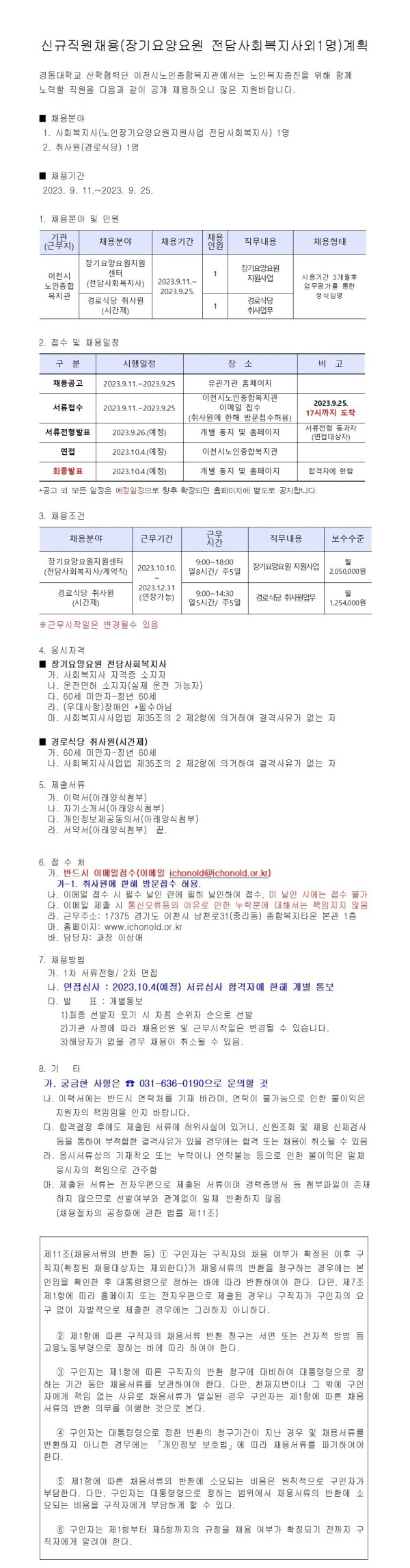 - 다음글이천시노인종합복지관 신규직원 채용 최종합격자 공고(장기요양요원 전담사회복지사) 2023-08-31