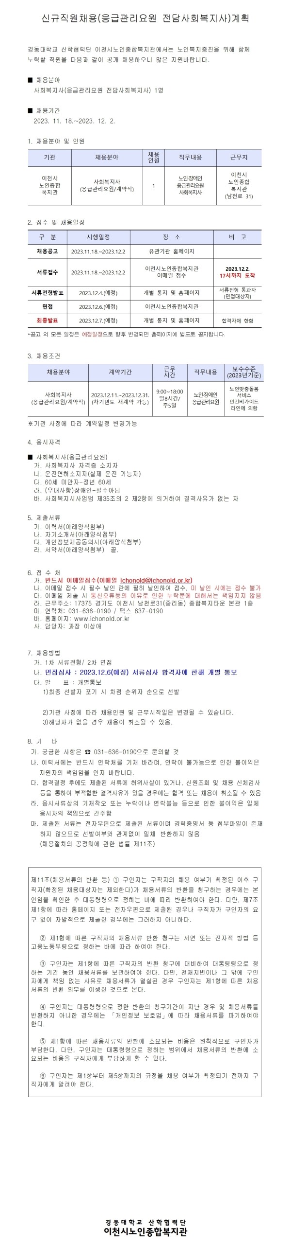 - 다음글이천시노인종합복지관 신규직원 (장기요양요원 전담사회복지사외 3명) 채용 공고 2023-11-13