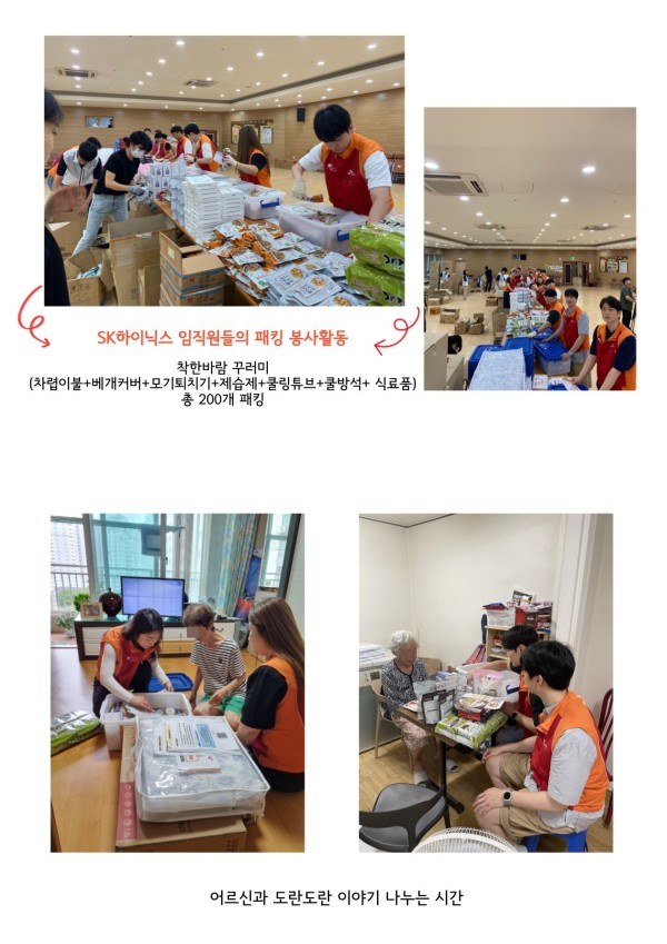 이번 봉사활동은 SK하이닉스 임직원들이 패킹 봉사활동을 통해 착한 바람 꾸러미(1인당 15만원 상당) 포장봉사 진행 및 복지관 인근 취약노인 가정을 방문하여 후원품을 전달하였습니다