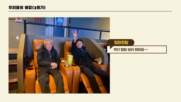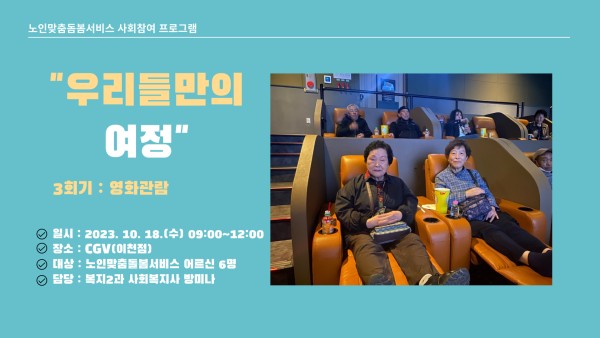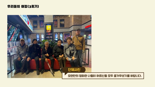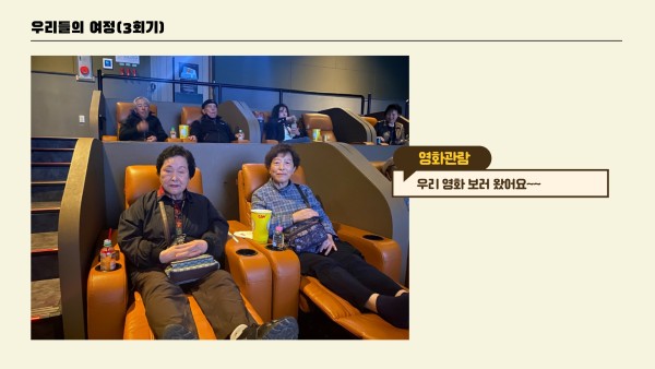 노인맞춤돌봄서비스 사회참여 프로그램 "우리들의 여정" 3회기로 영화관람(영화제목: 30일)이 진행되었습니다.