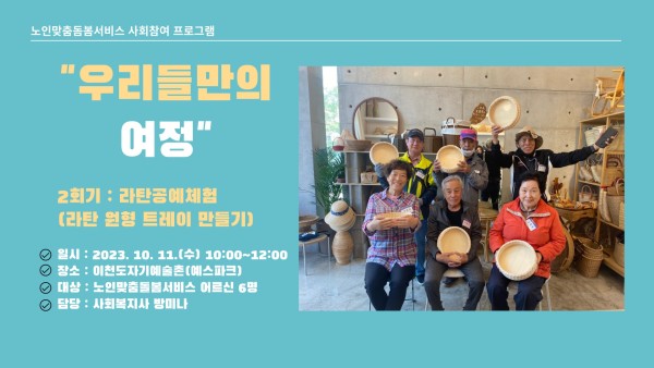 노인맞춤돌봄서비스 사회참여 프로그램 "우리들의 여정" 2회기로 라탄공예 체험을 진행하였습니다.