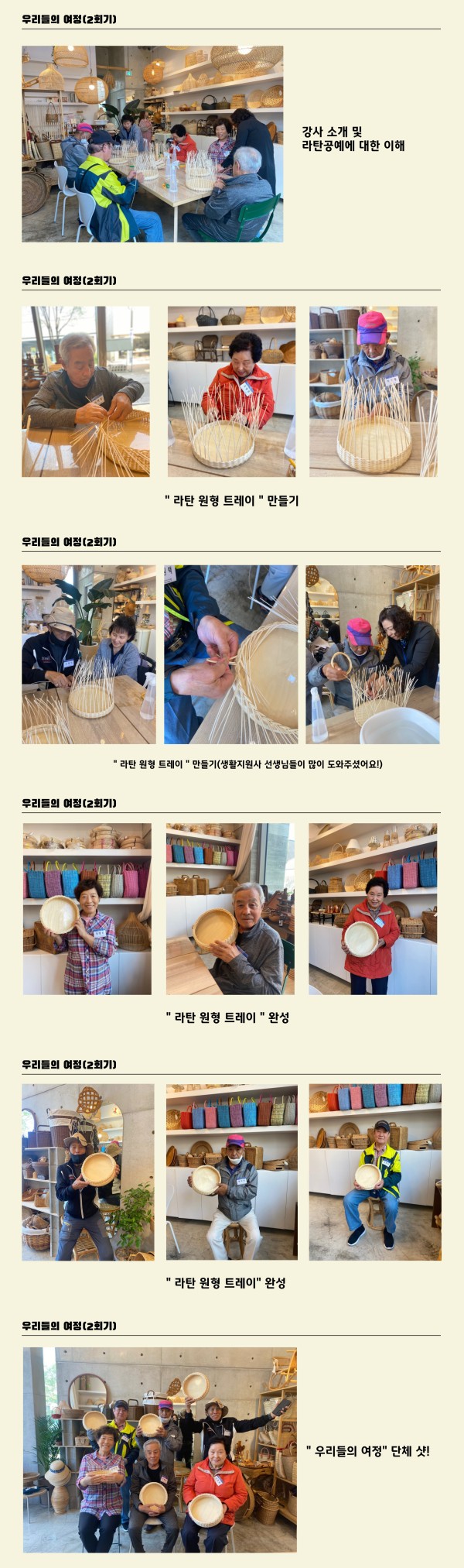 어르신들이 처음해보는 경험에 재미있어 하시며, 집중하여 라탄 원형 트레이를 만드셨습니다.