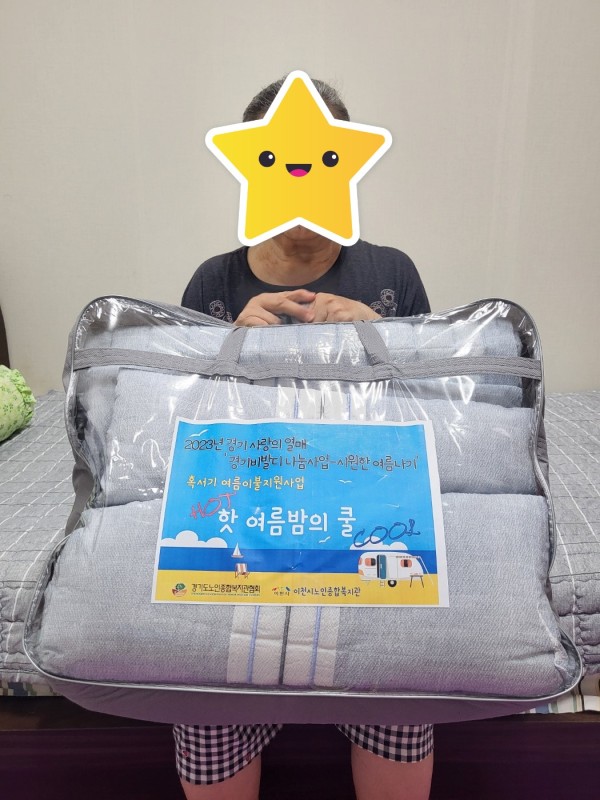 이에, 이천시노인종합복지관은 '핫 여름밤의 쿨'-혹서기 여름이불지원사업을 신청하고, 이천시 취약계층 어르신들 19명에게 직접 방문하여 배분하였습니다.