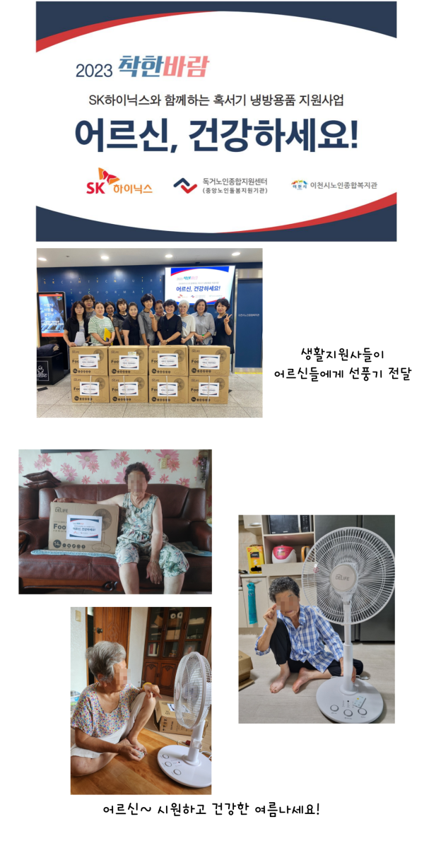 2023년 SK하이닉스와 함께하는 '착한바람 캠페인' 혹서기 냉방용품 지원사업이 폭염 및 취약 요보호 노인에게 냉방용품(창문형, 에어컨, 선풍기) 지원을 통해 온열 질환 예방과 안전 확보 및 경제적 어려움을 해소하고자 다음과 같이 진행되었습니다.