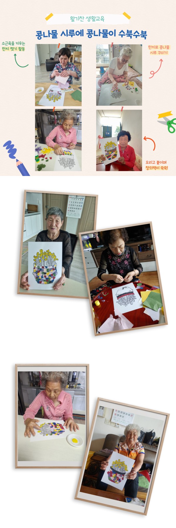 활기찬 생활교육 여섯번째 시간으로 "콩나물 시루에 콩나물이 수북수북" 프로그램을 진행하였습니다.