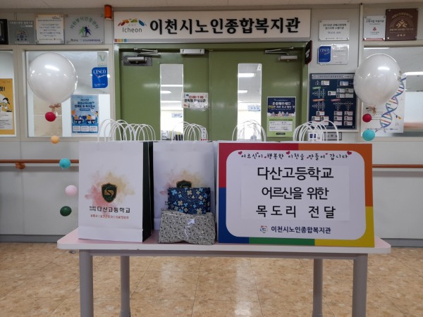 학생들은 추운 겨울 어르신들을 생각하며 틈틈히 뜨게질로 목도리를 만들었다고 합니다