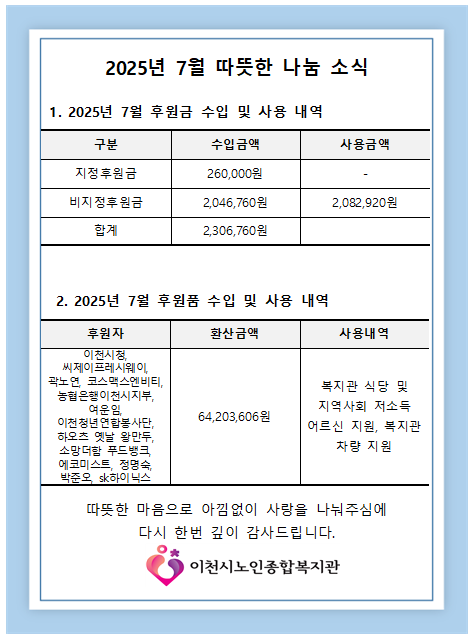 복지2과 [복지2과] 2025년 7월 후원금품 소식 페이지 정보 작성자이천노인종합복지관 작성일2025-08-19 조회수 40 본문 아낌없는 사랑에 깊이 감사드립니다. 이전글[복지2과] 2025년 8월 후원금품 소식 2025-09-22 다음글[복지2과] 2025년 6월 후원금품 소식 2025-07-25 목록