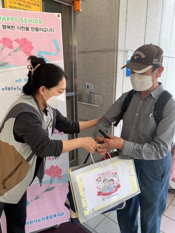 이날 행사를 통해 이천시노인종합복지관 취약계층 재가어르신인 밑반찬 서비스 수혜자 150명에게 카네이션 화분과 전병과자세트를 전달하였고,