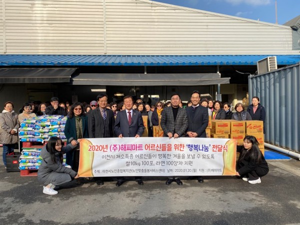 해피마트는 매년 겨울, 이천시노인종합복지관을 통해 지역의 어르신들을 위해 식품을 후원하고 있습니다.