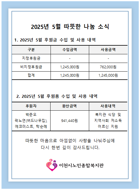 복지2과 [복지2과] 2025년 5월 후원금품 소식 페이지 정보 작성자이천노인종합복지관 작성일2025-06-20 조회수 30 본문 아낌없는 사랑에 깊이 감사드립니다. 이전글[복지2과] 2025년 6월 후원금품 소식 2025-07-25 다음글[복지2과] 2025년 4월 후원금품 소식 2025-05-23 목록