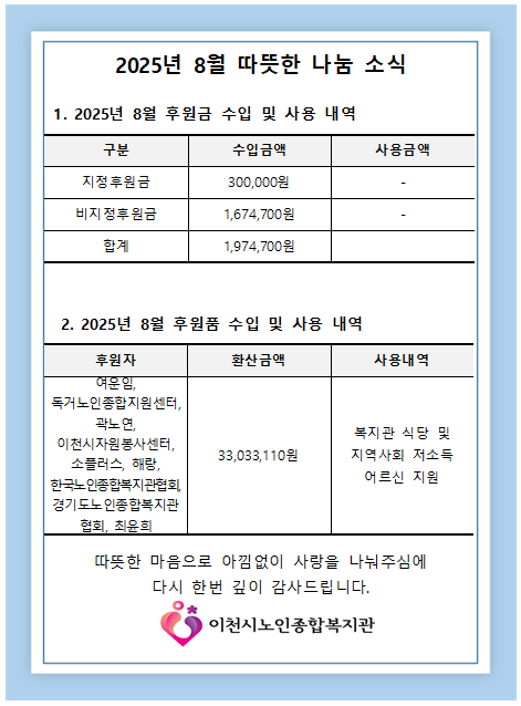 복지2과 [복지2과] 2025년 8월 후원금품 소식 페이지 정보 작성자이천노인종합복지관 작성일2025-09-22 조회수 28 본문 아낌없는 사랑에 깊이 감사드립니다. 이전글[복지2과] 2025년 9월 후원금품 소식 2025-10-27 다음글[복지2과] 2025년 7월 후원금품 소식 2025-08-19 목록