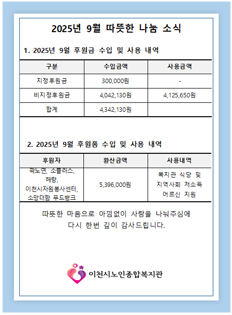 복지2과 [복지2과] 2025년 9월 후원금품 소식 페이지 정보 작성자이천노인종합복지관 작성일2025-10-27 조회수 73 본문 감사드립니다. 이전글[복지2과] 2025년 10월 후원금품 소식 2025-11-17 다음글[복지2과] 2025년 8월 후원금품 소식 2025-09-22 목록