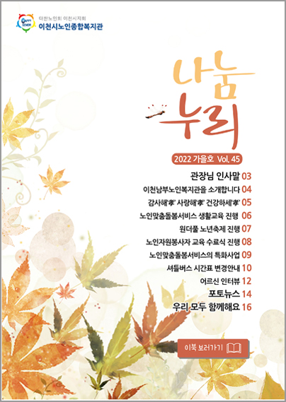 나눔누리 Vol.45 페이지 정보 작성자최고관리자 작성일2025-03-14 조회수 33 관련링크 http://www.yesebook.co.kr/EBOOKS/ichonold05/#book/page1 본문 나눔누리 Vol.45 이전글나눔누리 Vol.46 2025-03-14 다음글나눔누리 Vol.44 2025-03-14 목록