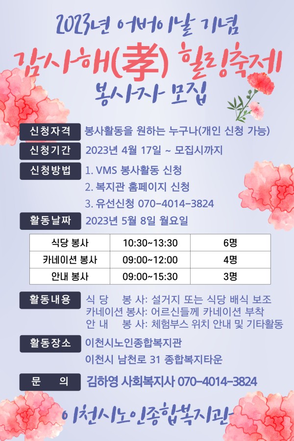 - 이전글2023년 제 51회 어버이날 기념 감사해(孝) 힐링축제 행사 참여 안내 2023-04-24