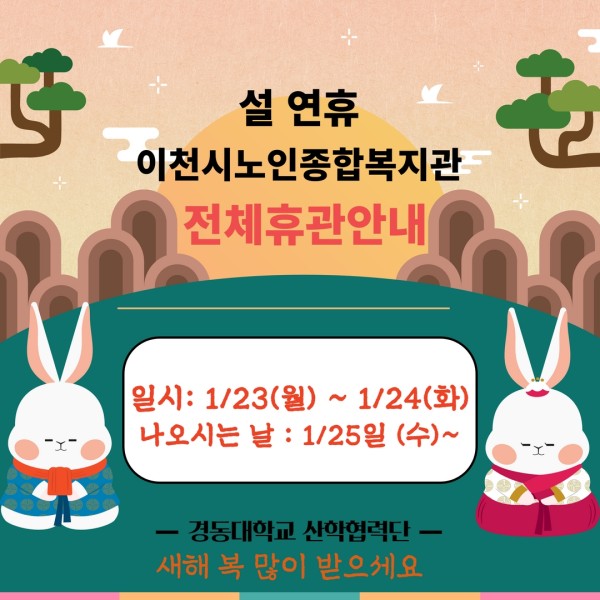 우리고유의 명절인 설 연휴를 맞아 이천시노인종합복지관이 전체 휴관을 합니다.